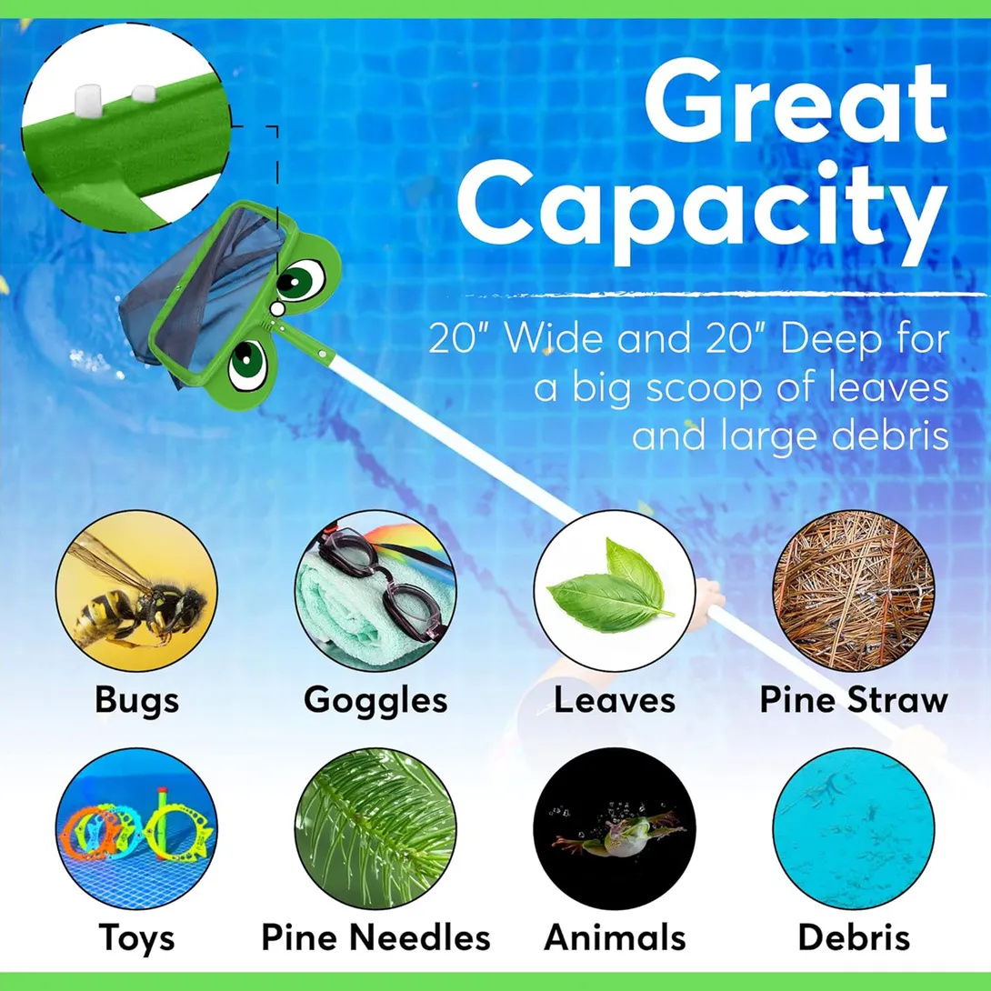 20" wide mouth and 12" net depth, the Ms. Frog skimmer net allows for efficient cleaning of all corners of your pool or spa. The angled side walls make it a breeze to scoop up debris from the water's surface.